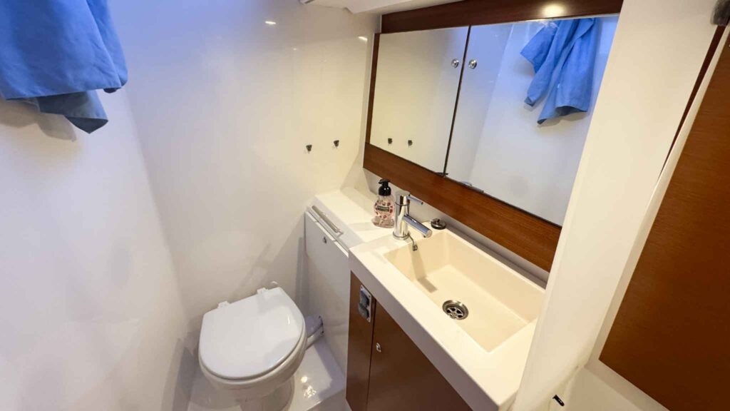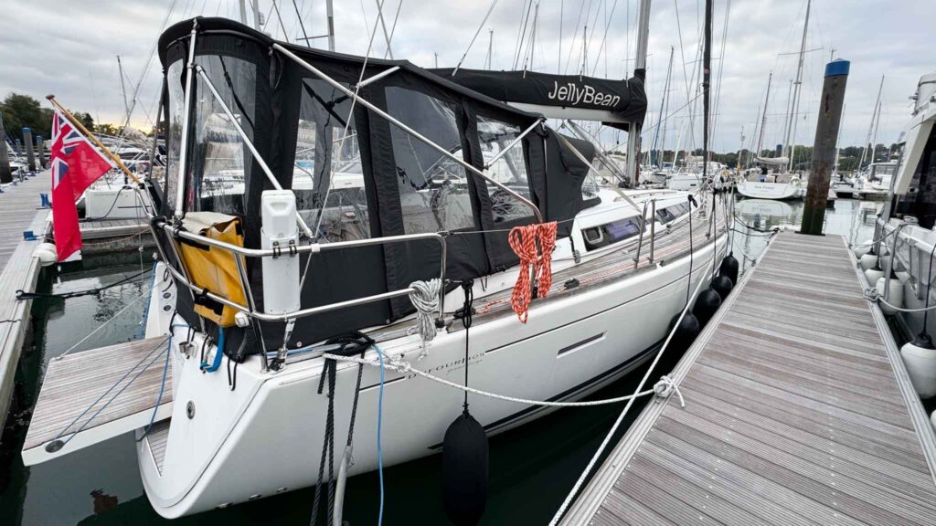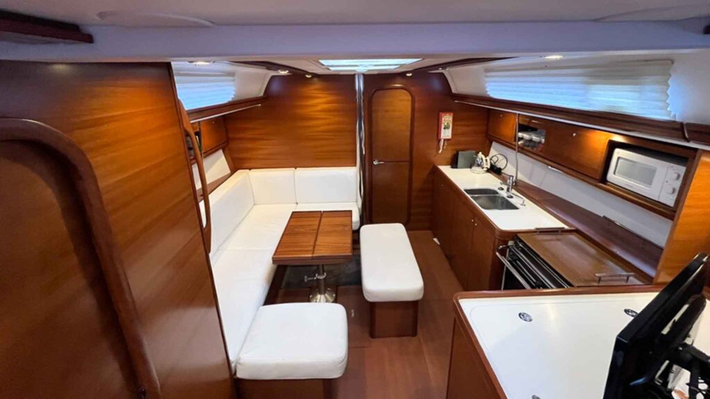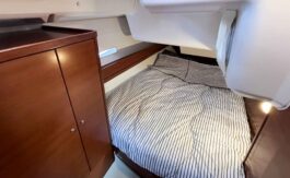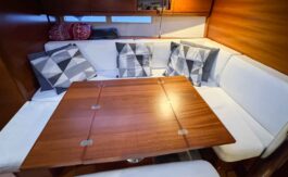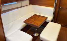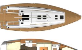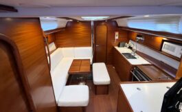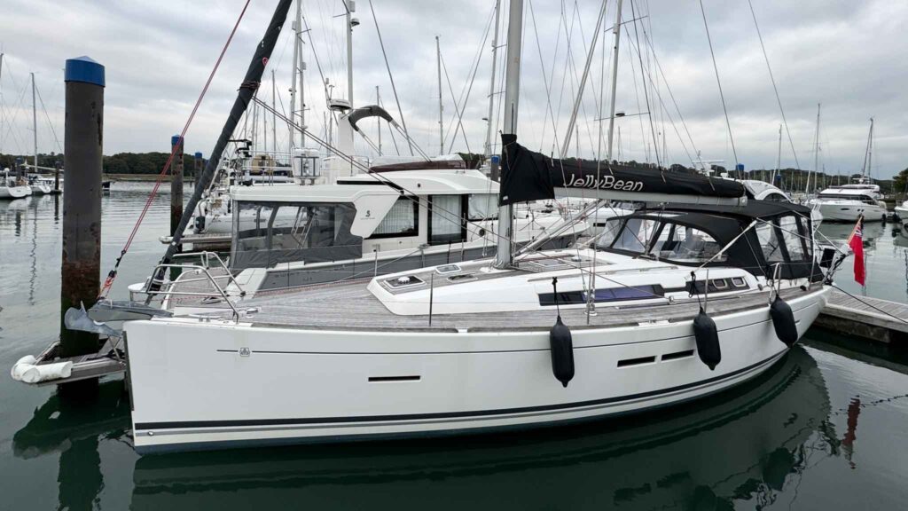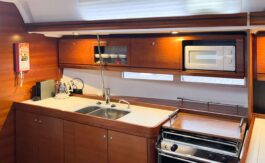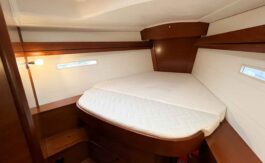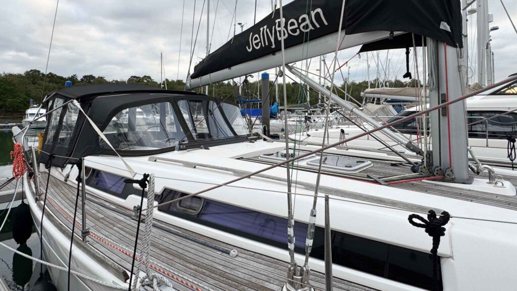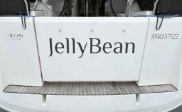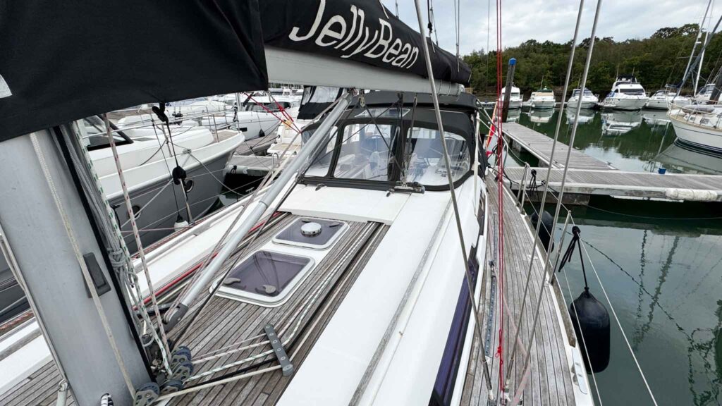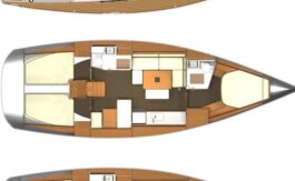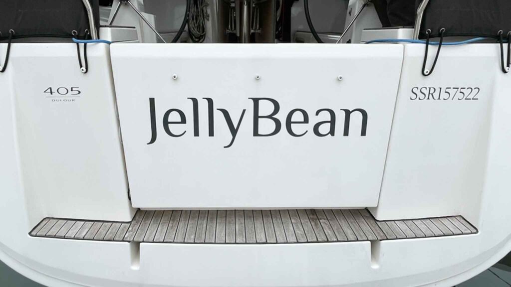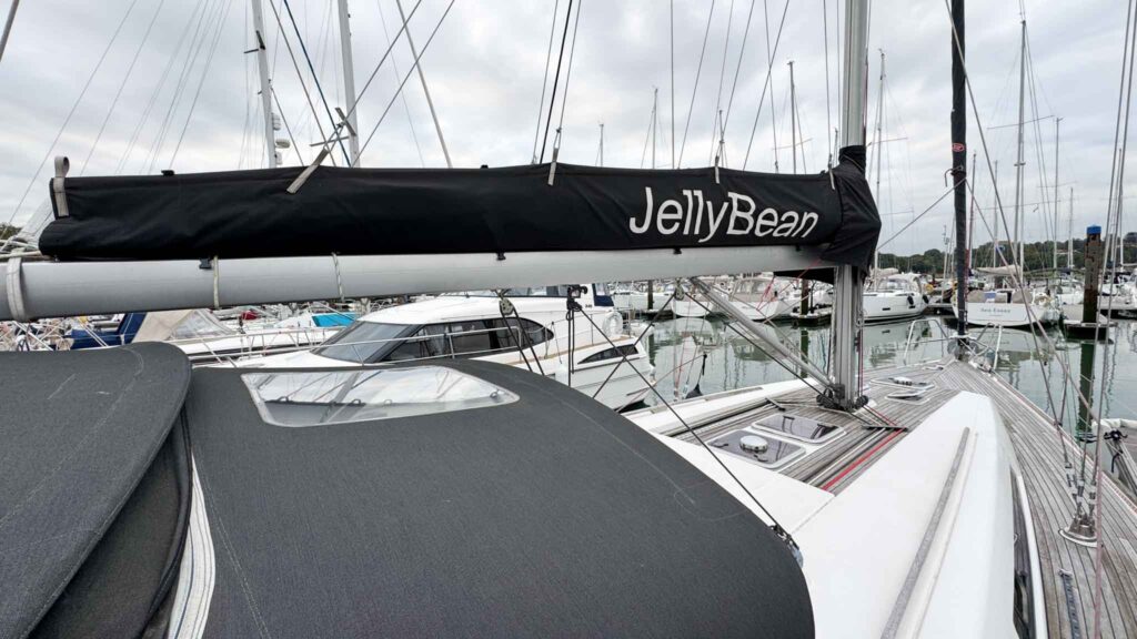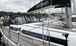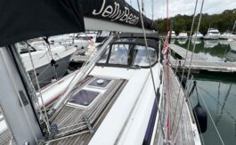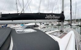 Jelly Bean has a fully battened main sail, furling jib and a furling code 0, with all lines led back to the cockpit for ease of use especially when sailing short handed. She has the preferred 3 cabin layout with day heads aft and an en suite for the master cabin forward.