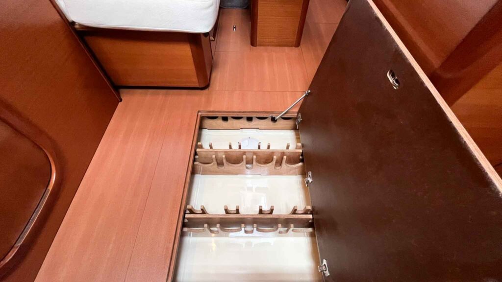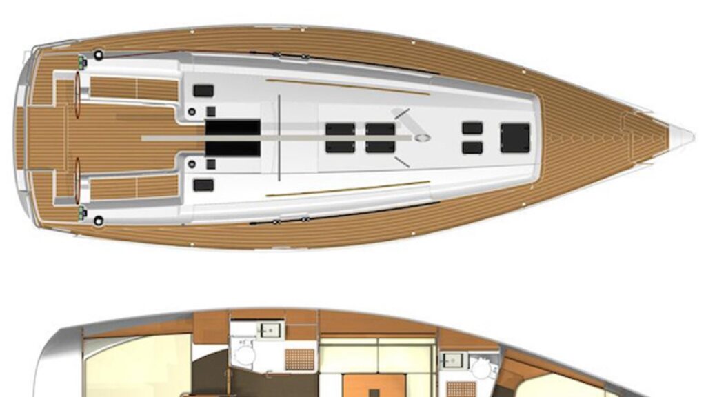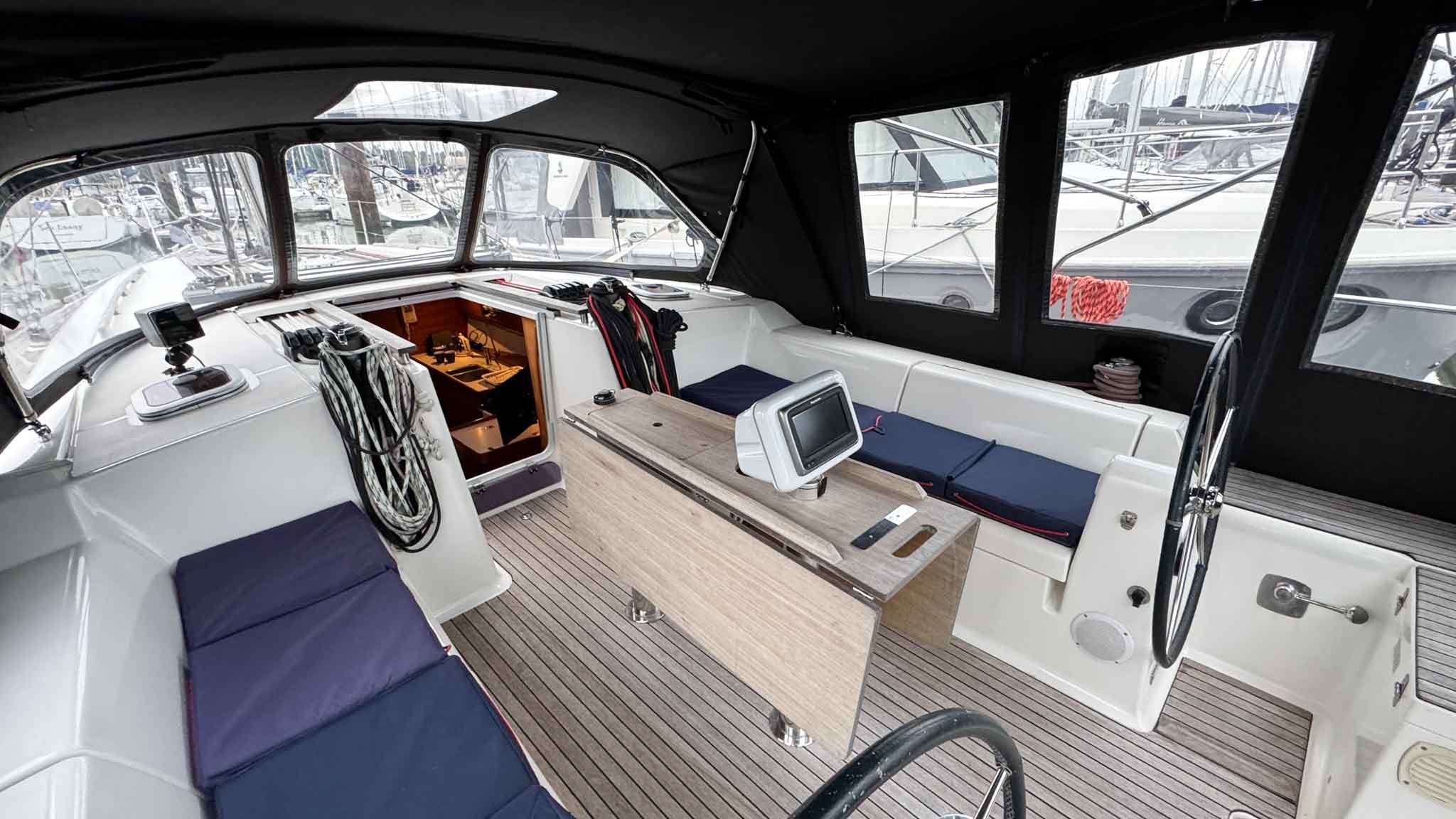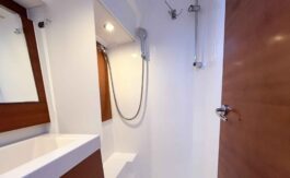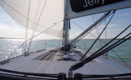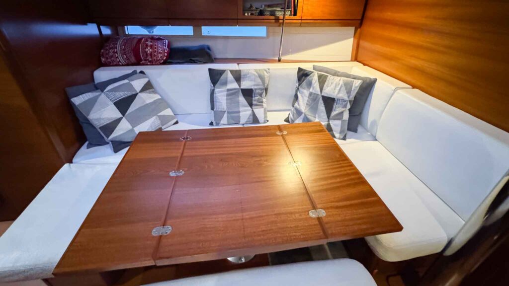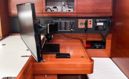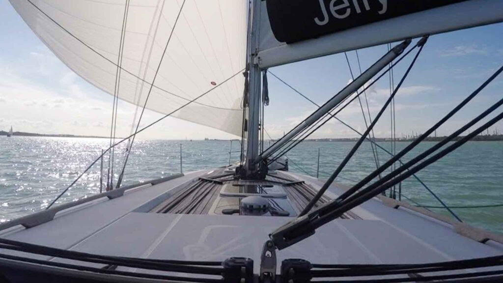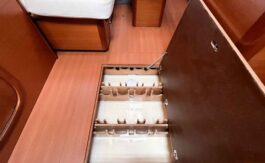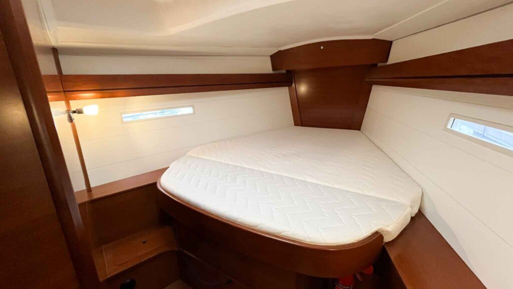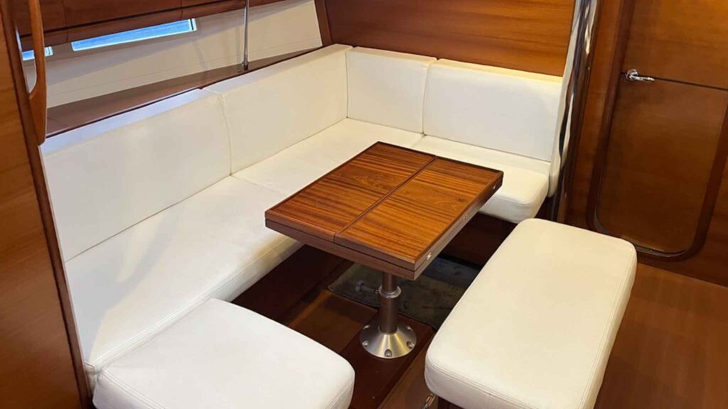 Jelly Bean has a fully battened main sail, furling jib and a furling code 0, with all lines led back to the cockpit for ease of use especially when sailing short handed. She has the preferred 3 cabin layout with day heads aft and an en suite for the master cabin forward.