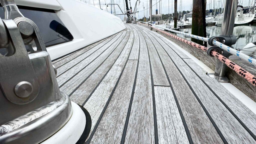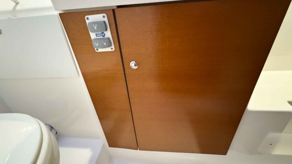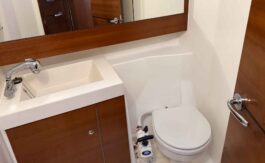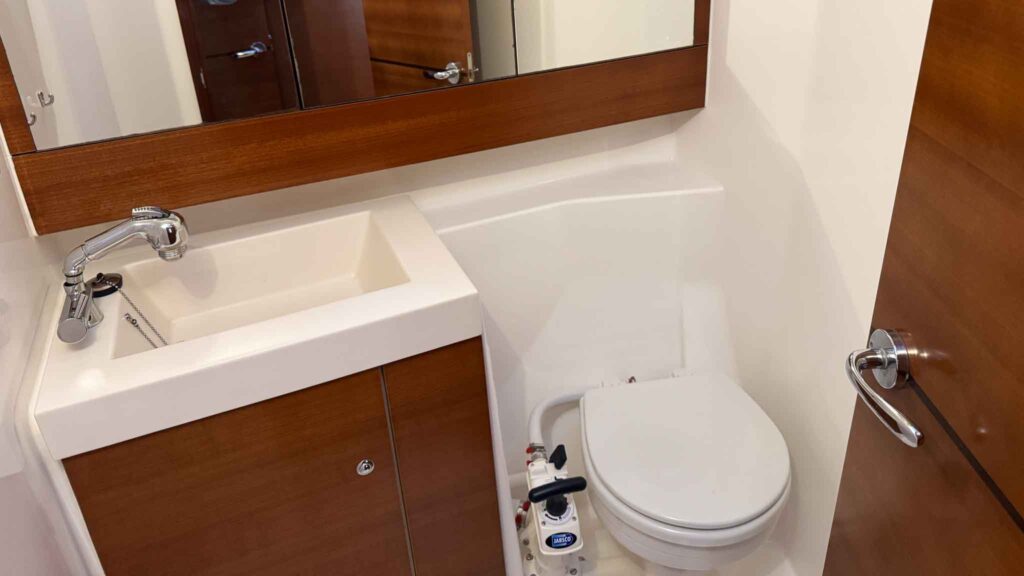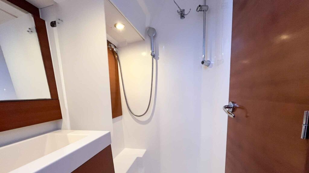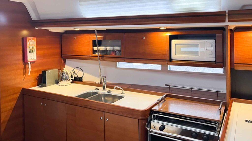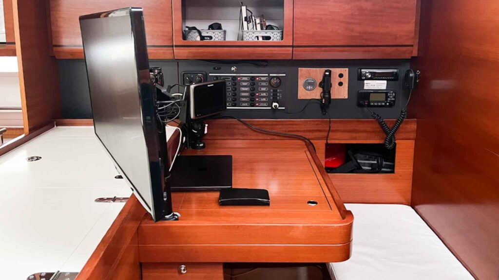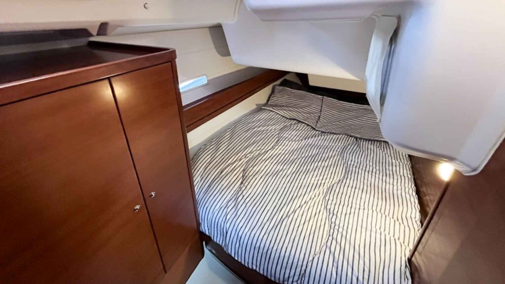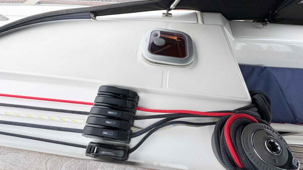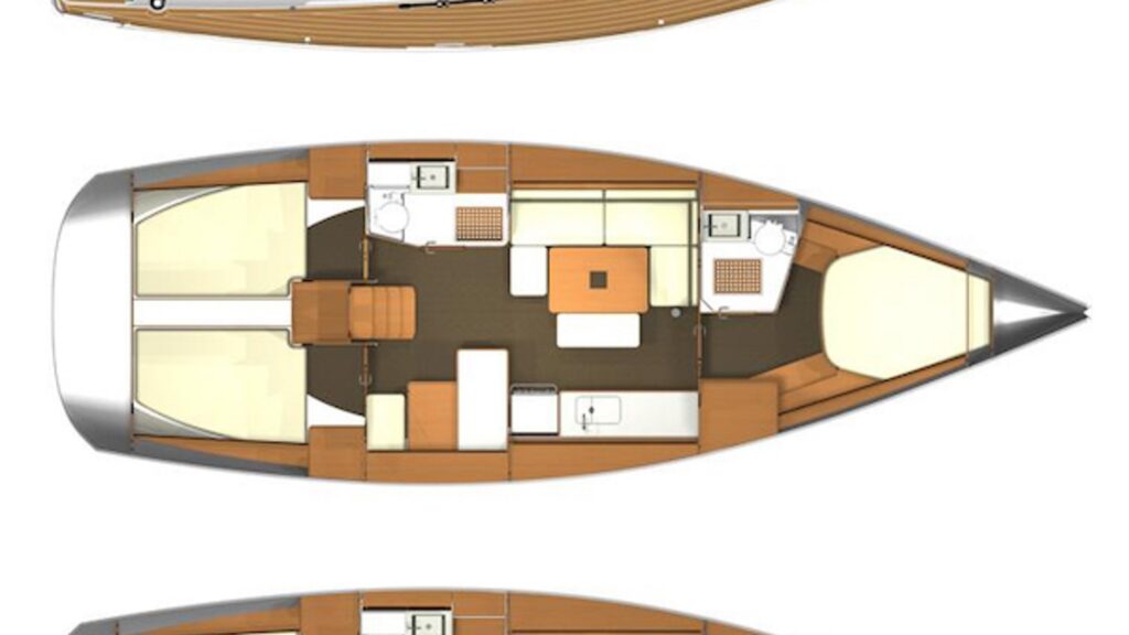 Jelly Bean has a fully battened main sail, furling jib and a furling code 0, with all lines led back to the cockpit for ease of use especially when sailing short handed. She has the preferred 3 cabin layout with day heads aft and an en suite for the master cabin forward.