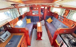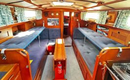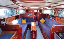 Saloon: Port & starboard settees, drop-leaf table, occasional berths, built-in freezer and wine locker, extensive storage