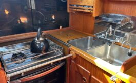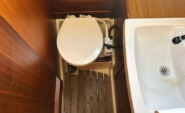 Galley: L-shaped, 2-burner Eno gas cooker (2007), fridge, freezer, double sink, pressurised and manual water taps