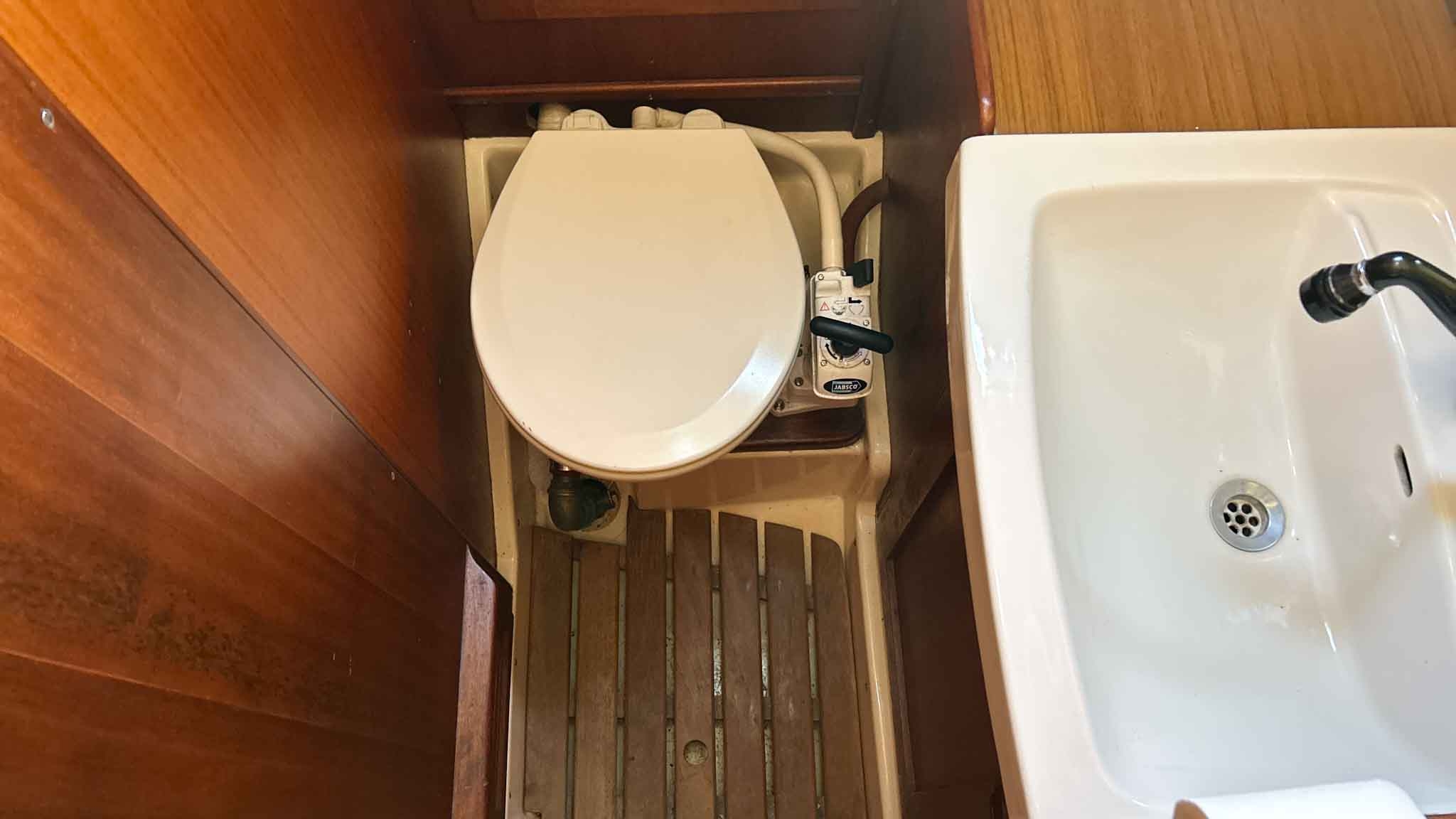 Heads: Jabsco manual toilet, shower head, vanity, teak grating, holding tank