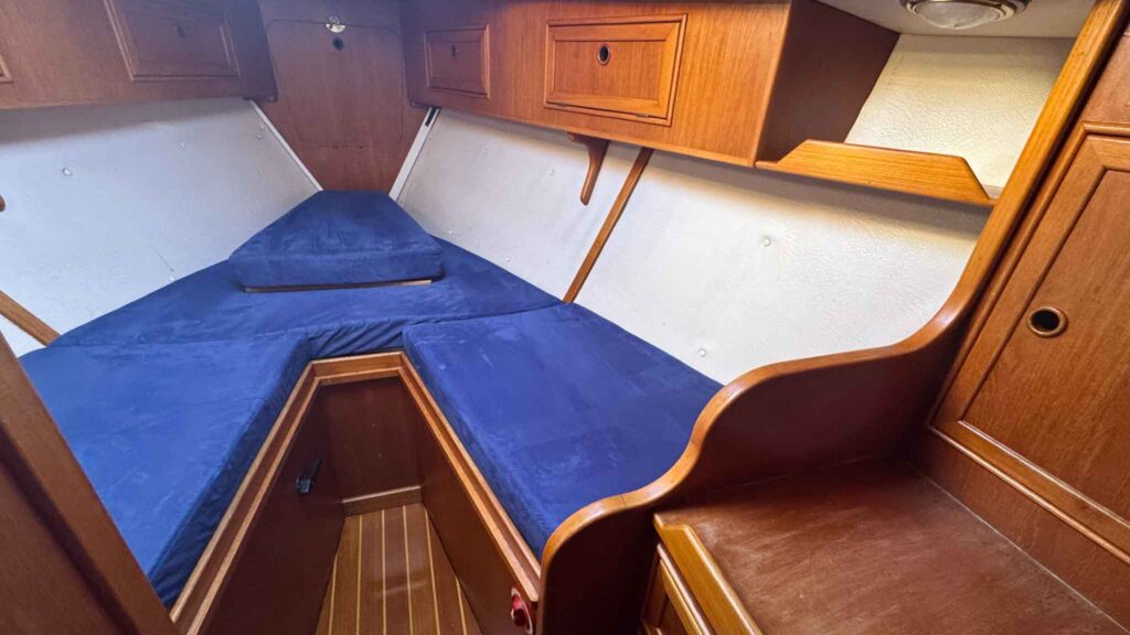 Forward cabin: V-berth with in-fill (double), storage, overhead hatch
