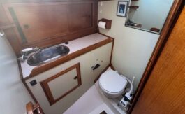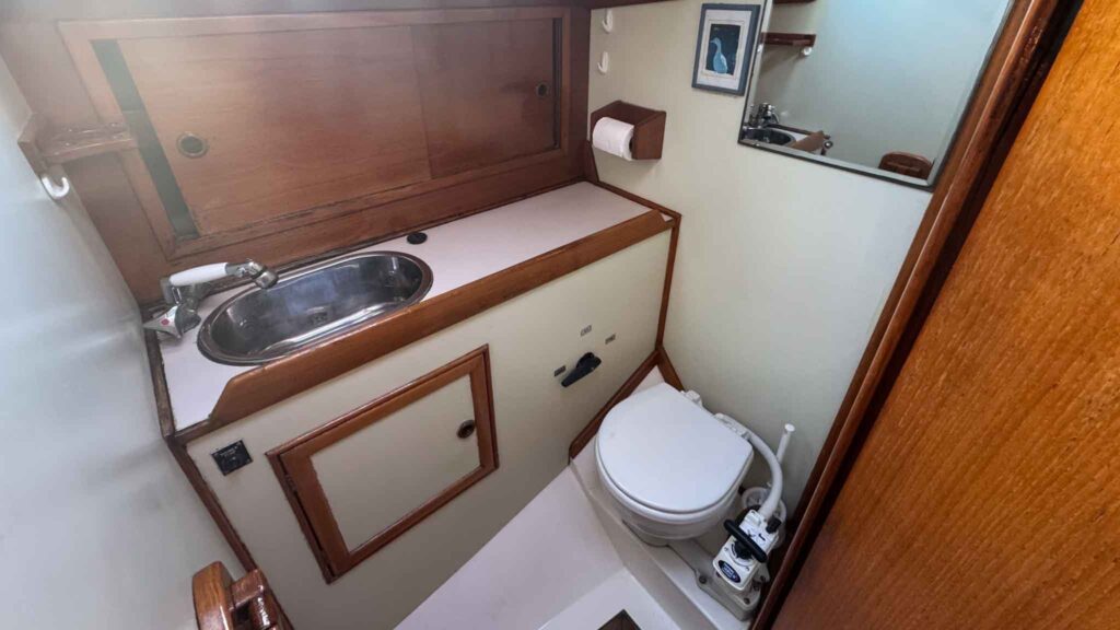 Heads: Refurbished Jabsco toilet (2024) with holding tank, shower head, and vanity unit