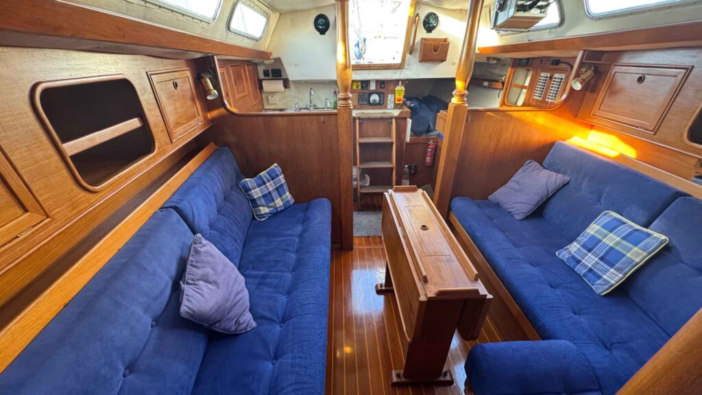 Comfortable Cruising: Sleeps 7 across 2 cabins + saloon, with heating, pressurised hot water, fridge, and full galley