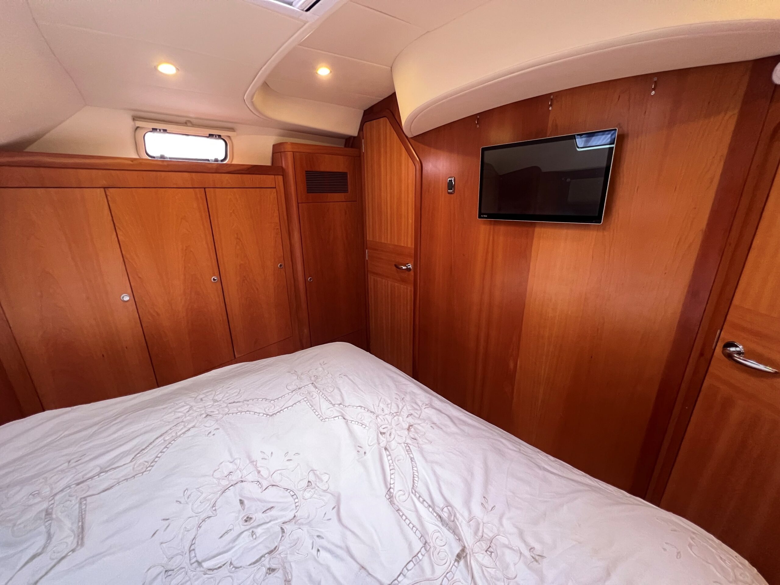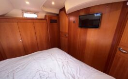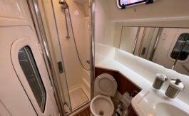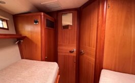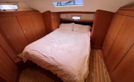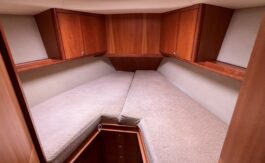 Large forward cabin is fitted with vee berths, which convert to a double, with good storage