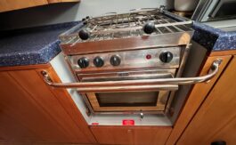 Fully gimballed gas cooker with three burners, grill and oven