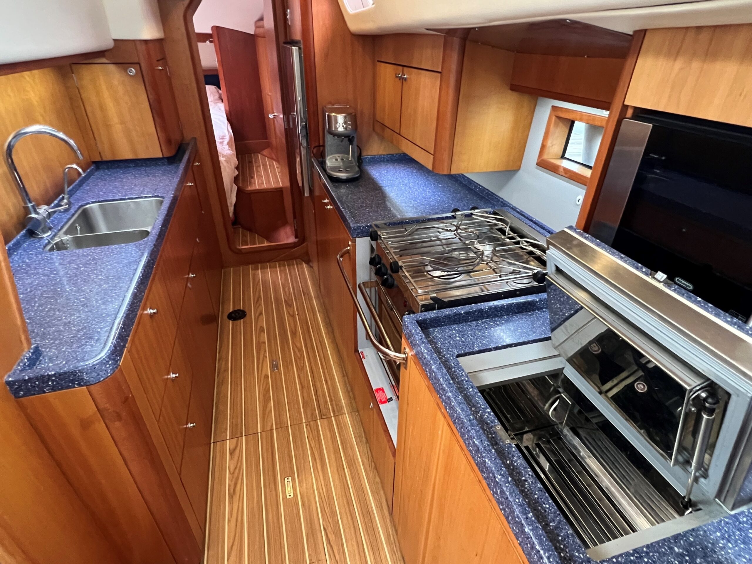 Cabin soles in teak striped non-slip laminate