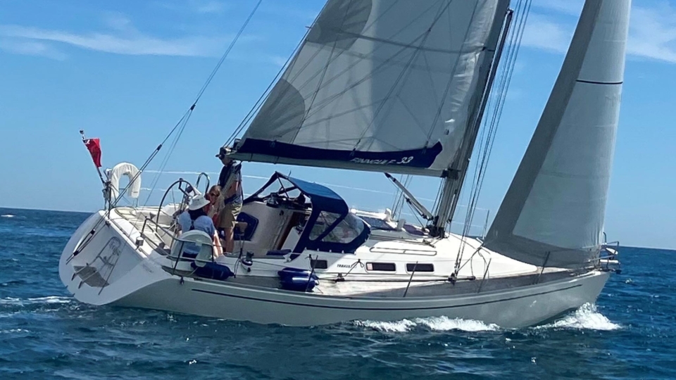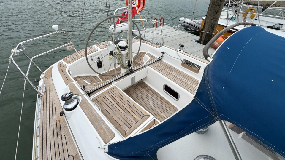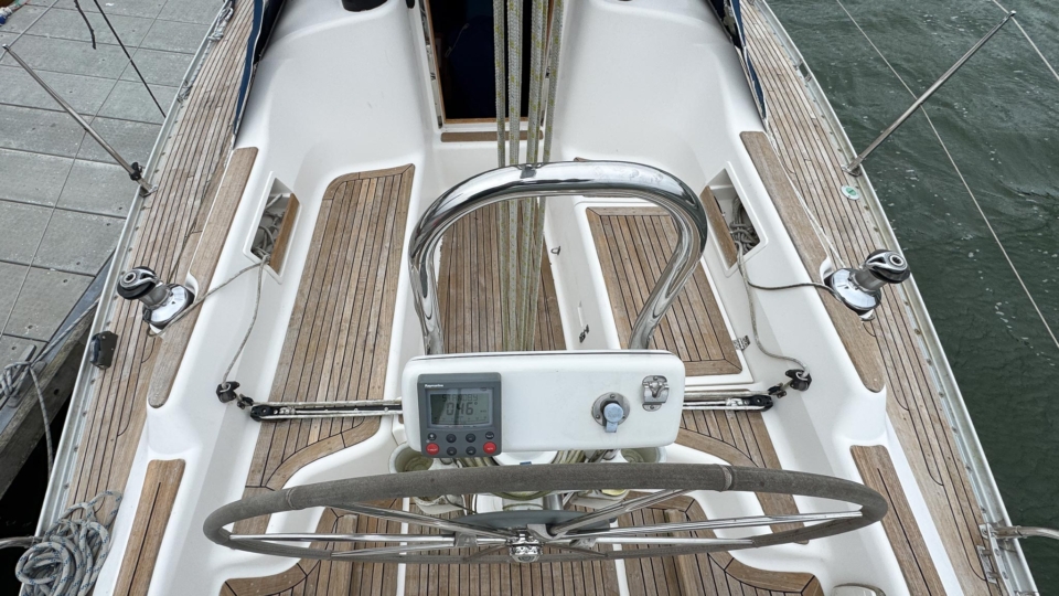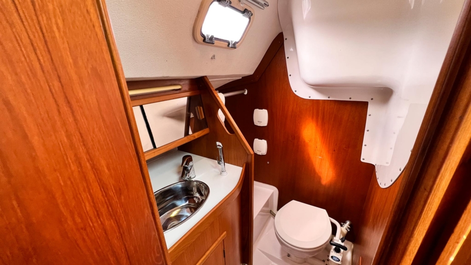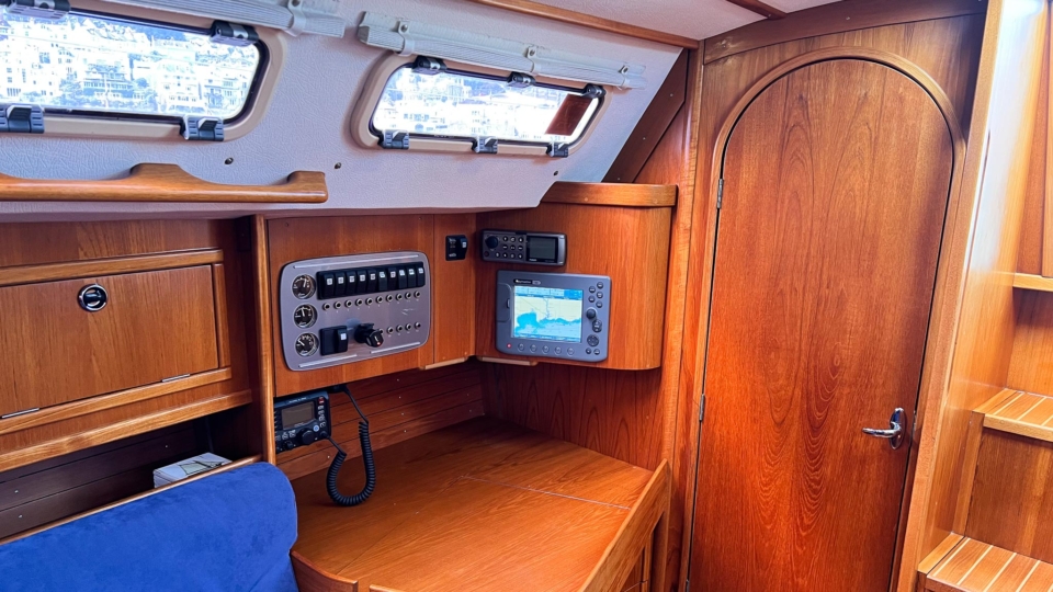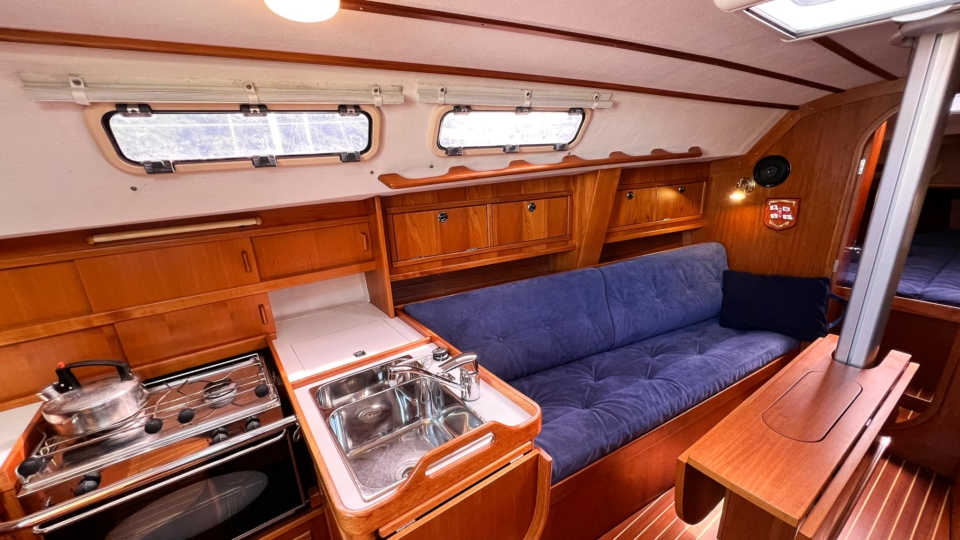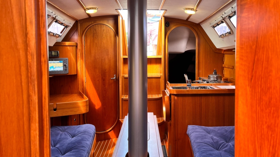 This Finngulf 33 has a fractional rig, fin keel with a bulb and spade rudder, all combining to give her a responsive helm and good upwind performance. All of the lines are led into the cockpit for safety. The mainsheet and primary winches are within reach of the helm so short handed sailing is a doddle. There are two ample double cabins below for extended cruising, along with a swim platform and ladder for easy swimming access.
