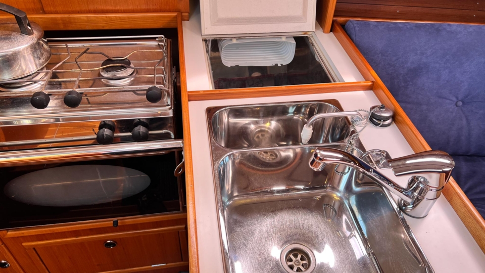 • Manual foot pump in galley
