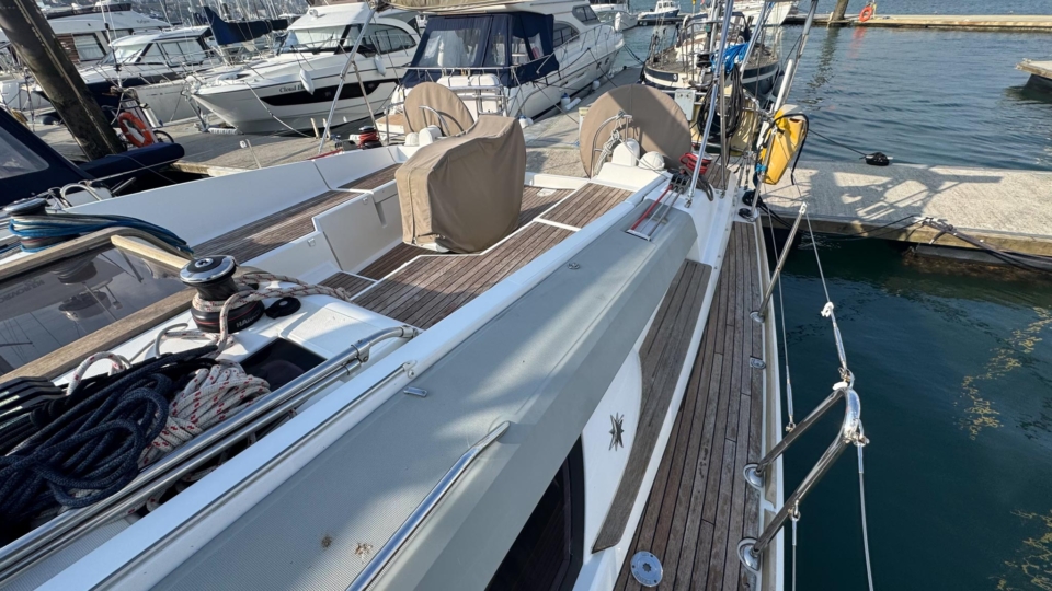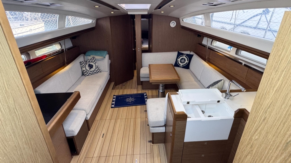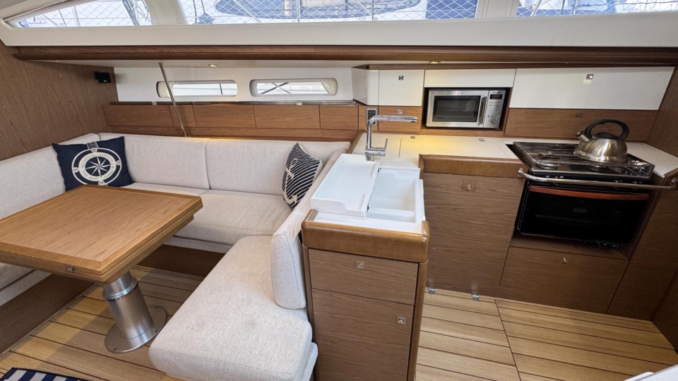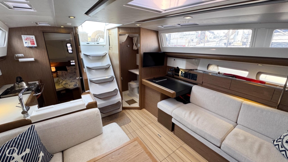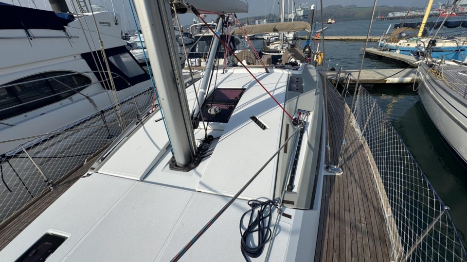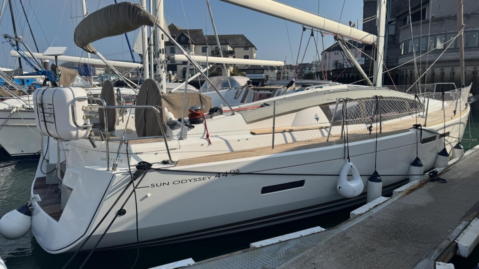 Jeanneau Sun Odyssey 44 DS Jeanneau Yachts Overview Price£175,000 inc. Year Built 1800 Model 44DS Length 13.34 Berths 5 LyingFalmouth, UK Jeanneau Yachts Image Gallery Exterior Interior View 56 images Enquire about this Yacht Contact a Red Ensign broker to discuss a yacht or your plans in confidence. SPEAK TO BROKER Enquire about this boat Falmouth Office Port Pendennis Marina, Challenger Quay, Falmouth TR11 3YL 01326 313143 | info@red-ensign.com Jeanneau Yachts - 44DS EmailThis field is for validation purposes and should be left unchanged.BoatName(Required) Name Email(Required) PhoneMessage(Required) Specification Manufacturer Jeanneau Yachts Model 44DS Designer Philip Briand Hull Material GRP Beam (m) 4.24 Draft (m) 2.2 Displacement (kg) 9750 Engine Yanmar - 4JH5-CE Engine HP 54 Engine Hours 700 Cabins 3 Berths 5 WC/Heads 2 Overview Experience exceptional comfort, performance, and modern design aboard this 2013 Jeanneau Sun Odyssey 44 Deck Saloon—a highly sought-after model known for its spacious layout, light-filled interior, and impressive sailing capabilities. This preferred two cabin plus bunk cabin, deep-keel configuration offers the perfect balance of luxury cruising and confident offshore performance A 2013 example, built in 2013 delivered to the first owner at the end of 2013. This beautiful Deck Saloon yacht is in fantastic condition, with low engine hours and the superb 2 heads layout, offering unrivalled comfort in this size bracket. Loaded with options, to include Triskel generator system, electric winches, diesel heating, autopilot, Mylar Taffets sails (original sails still unused & available), inverter, code 0, comprehensive Raymarine nav system, life raft, cockpit enclosure, extended water tanks, STARLINK system, standing rigging from 2023, sail drive seal from 2026 and much more “TOPAZ” is now available for immediate viewing and purchase from Pendennis Marina, Falmouth. She has to be one of the best 44 DS afloat. Equipment and Information CONSTRUCTION Hull deck and superstructure are all of GRP – WHITE Deep Fin Keel Spade Rudder Black antifouling – applied February 2026 Teak laid decking in the cockpit Full teak side decks Twin Wheels Cream woven material upholstery Walnut veneer interior wood finish. MACHINERY + ELECTRICS Yanmar 4JH5-CE – extremely light usage and full servicing. 54hp diesel 3-blade folding propeller with rope cutter New saildrive seal 2026 Bowthruster in a tunnel Tankage: Fuel capacity: 200 litres Water capacity total: 550 litres (additional 200 litre water tank) Holding tank for aft heads – 80 litres Triskel generator system Domestic battery bank renewed 2023 Separate engine battery Separate bow thruster battery Shore power system – 240V ring main – all UK 3 pion sockets Inverter – powering microwave & TV & computer Hot water via calorifier – heated with engine & 240V DECK EQUIPMENT Teak side decks and cockpit – teak in excellent condition Delta anchor, 60m 10mm chain Electric windlass controlled on deck and at helm Chain counter Kedge anchor & chain + warp Double anchor roller on bow Harken electric winch on coachroof (Port side) + 2nd coachroof winch to starboard Harken primary winches, upgraded to electric – ‘REWIND’ models – HARKEN 46 Genoa tracks with adjustable cars Spinlock jammers on coachroof + forward of each primary winch for main & jib sheets Midship cleats Lifeline gates Leather covered steering wheels Folding cockpit table with teak top – storage for bottle within Open aft transom with telescopic ladder Genoa and german mainsheet system led to aft cockpit winches – easy management by helmsman Sprayhood, bimini + full cockpit enclosure – all in excellent condition Outboard engine bracket Cockpit shower (H+C) swim ladder Dropdown washboard Davit for lifting outboard ACCOMMODATION 2 x cabin version plus bunk cabin with 2 x heads Diesel warm air Webasto heating system throughout – all cabins & heads Interior in immaculate condition Blinds throughout LED lighting throughout Forward guest cabin Large double berth Large hanging locker + deep cabinet with shelves Desk / vanity unit with storage Bunk cabin – Port side 2 offset single bunks Owners aft cabin Large hanging locker Side tables covered in leatherette – storage under Seats to either side of berth in cream leatherette Saloon with luxury folding saloon table on adjustable pedestal – electrically operated Navigation station L-shaped galley with two stainless steel sinks 2-burner hob with oven and grill Front opening fridge door 220v Microwave – operates from inverter – SHARP Forward Heads with shower Marine w.c. with holding tank for forward heads Moulded sink, hot & cold pressurised water Aft heads Shower divider in aft heads Electric shower sump pump Electric heads NAVIGATION EQUIPMENT Chart table with storage, main electrical panel LED Navigation lights + TRI light Conventional steam and deck lights 2 x i70 multifunction displays + speed/depth/wind transducers Raymarine i70 SPX30 autopilot + gyro Hydraulic linear drive ram for autopilot Raymarine E95 HYBRID TOUCH GPS in cockpit – mounted on swivelling Scanstrut pod 4kw digital Raymarine radar DSC VHF radio (Raymarine 55E) at chart table + masthead aerial AIS transciever – digital Yacht All instruments (GPS & MAP) displayed in TV screen at chart table SMART TV mounted on bulkhead – Panasonic Computer system – operated to TV screen – HP Chrome Box Stereo CD/MP3 player through BOSE speakers & sound system – connects to outside cockpit speakers also Battery monitor system Starlink system – WiFi via router RIGGING & SAILS Standing rigging from 2023 2 spreader Z Spar rig In mast furling with swept back spreaders Sails: Furling mainsail Mylar Taffeta with vertical battens Mylar Taffeta furling headsail (Original dacron sails available and unused) Code 0 – Xgrid – Mylar/Aramid Extra genoa halyard & 2:1 purchase for code 0 SAFETY Automatic fire extinguisher in engine space Fir